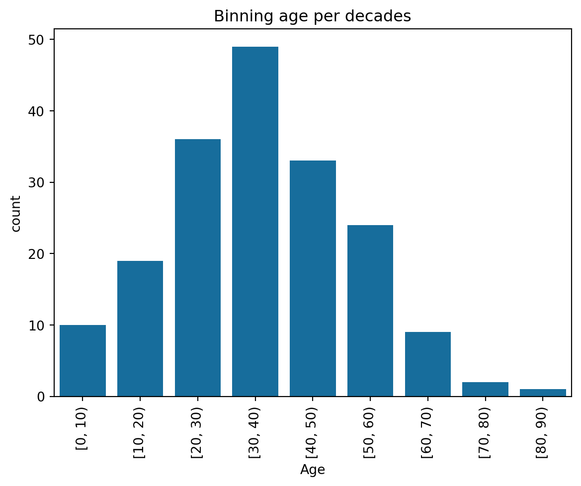 plt.title("Binning age per decades")Text(0.5, 1.0, 'Binning age per decades')